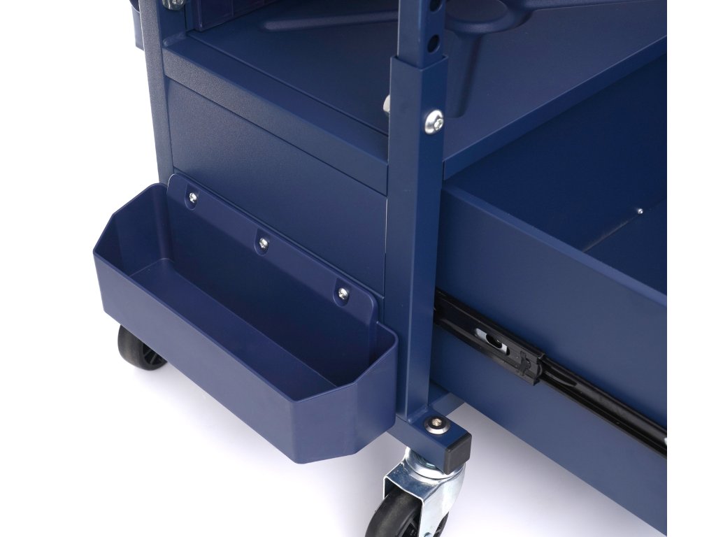 Scaunul de atelier KD10761 a fost proiectat pentru utilizare în ateliere profesionale, service-uri auto, centre de reparații și ateliere de acasă. Este echipat cu un scaun confortabil, patru roți, un sertar spațios și trei rafturi, în care pot fi plasate cu ușurință uneltele utilizate la lucru.