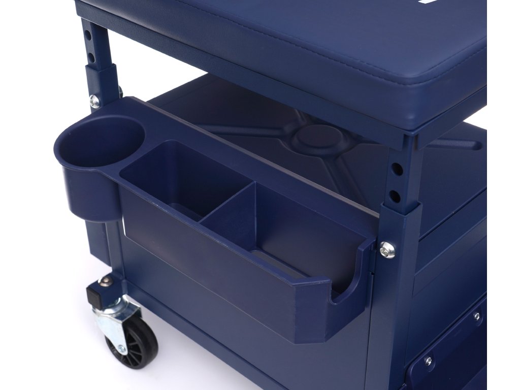 Taburetul cu roți oferă confort în timpul lucrărilor în atelier. Suportul confortabil de pe partea dreaptă poate fi folosit pentru prosop, unelte etc. Sub șezutul sunt fixate două cutii.