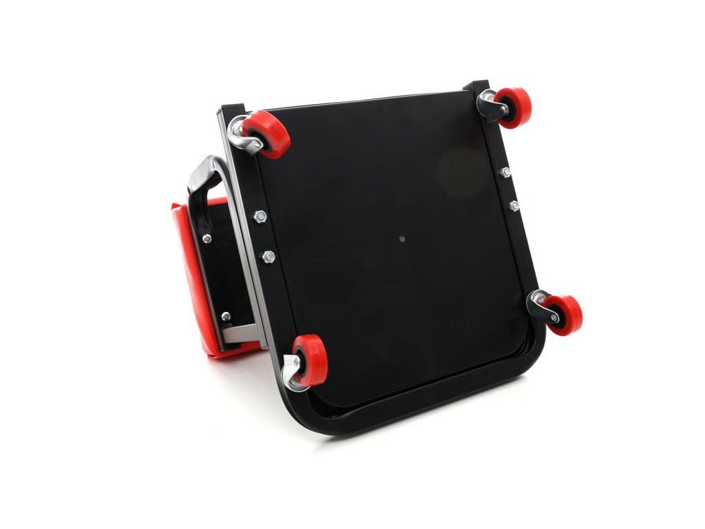 Pentru un plus de confort, scaunul este echipat cu raft pentru unelte, chei și șuruburi, pe care le folosim în timpul lucrului. Nu va mai fi nevoie să vă faceți griji pentru uneltele lăsate pe podea!