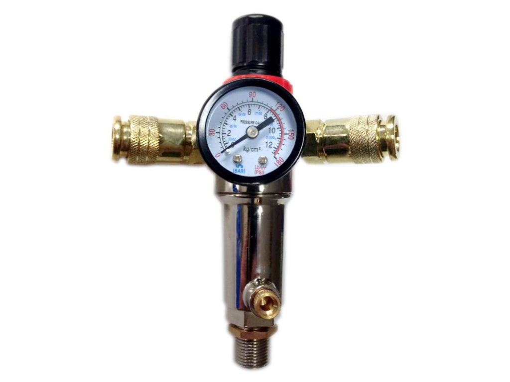 Acest dispozitiv oferă control total asupra calității aerului furnizat. Regulatorul cu manometru permite reglarea precisă a presiunii în sistemele de aer comprimat. Separatorul de apă, echipat cu un separator, curăță aerul comprimat de umiditate, ulei, condens și particule solide. Filtrația aerului comprimat protejează împotriva picăturilor de apă care pot cauza pete la vopsit sau coroziunea altor unelte.