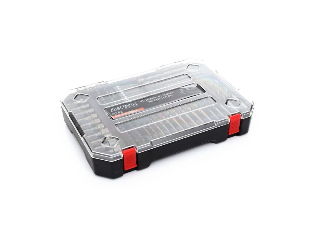 Set de burghie și biți 81 buc KD992, marca KRAFT&DELE, este fabricat din materiale de înaltă calitate, inclusiv oțel crom-vanadiu CrV. Burghiele metalice sunt din oțel rapid HSS conform standardului DIN338.