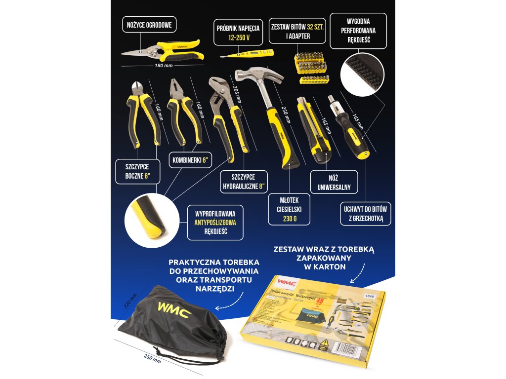Gama WMC Tools cuprinde șurubelnițe, clești, chei, burghie, pânze, polizoare, ferăstraie și seturi complete de scule, realizate din materiale rezistente la uzură și concepute pentru o utilizare confortabilă și sigură. Fiecare instrument este proiectat pentru a oferi precizie și eficiență, indiferent de complexitatea lucrării.