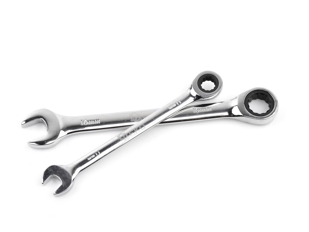 Set chei combinate cu clichet 12 buc, dimensiuni 8-19 mm, este fabricat din oțel crom-vanadiu (CrV) rezistent. Acest set este ideal atât pentru atelierele auto profesionale, cât și pentru garajul personal. Cheile sunt depozitate într-un suport practic, care poate fi agățat pe perete.