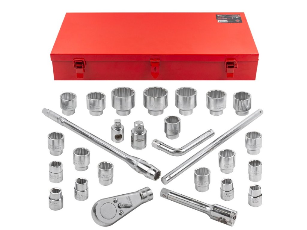 - Chei tubulare cu 12 vârfuri de 3/4" - 17 bucăți: 17mm, 19mm, 21mm, 22mm, 24mm, 27mm, 30mm, 32mm, 33mm, 34mm, 35mm, 36mm, 36mm (cu 6 vârfuri), 38mm, 41mm, 46mm, 50mm