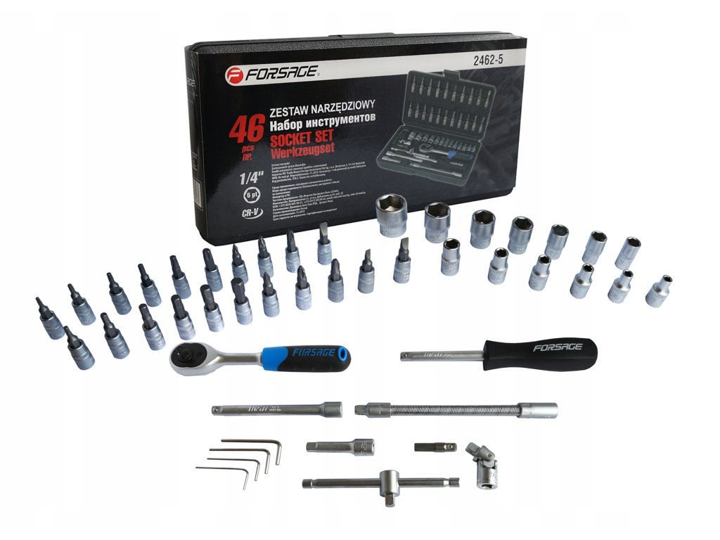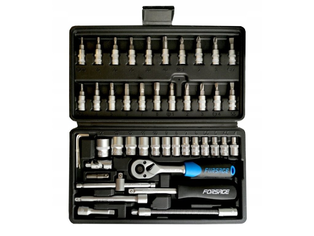 Setul de chei tubulare de 1/4" conține 46 de piese fabricate din oțel crom-vanadiu de înaltă calitate. Setul include un clichet cu mecanism durabil, o gamă largă de chei tubulare (dimensiuni 4-14 mm) și diverse tipuri de biți (plați, în cruce, hexagonali, Torx). Este completat de extensii, inclusiv flexibile, articulații cardanice, chei Allen, mânere și adaptor pentru biți.