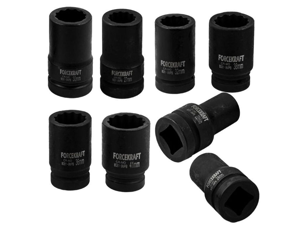 Set chei tubulare cu impact Forcekraft de 1" cu 9 bucăți, cu 12 și 4 laturi