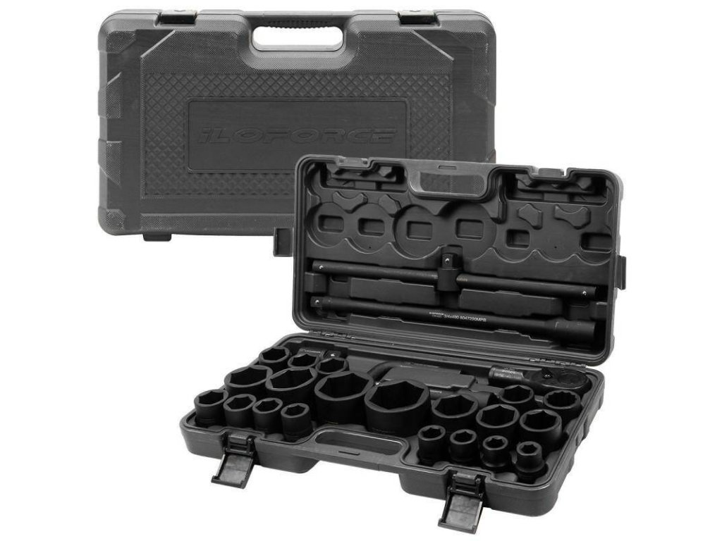 Setul profesional de scule de impact cu 26 de piese și capete hexagonale este conceput pentru lucrări solicitante în ateliere auto, industrie și service pentru utilaje grele. Include chei tubulare de dimensiuni 17-50 mm (3/4") și 55-65 mm (1"), un clichet robust, o extensie, o cheie în T și o sculă de impact. Datorită construcției sale de înaltă calitate, este ideal pentru lucrul cu chei pneumatice și manuale.