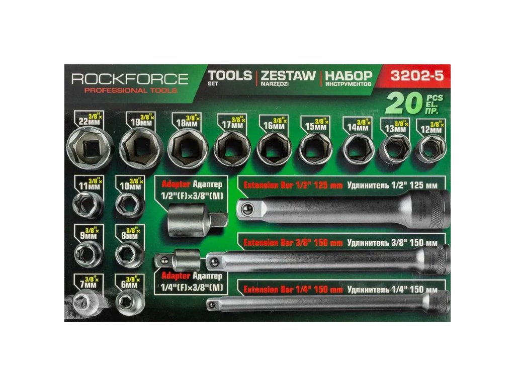 Set chei tubulare ROCKFORCE de 3/8", 20 buc., cu adaptoare și extensii