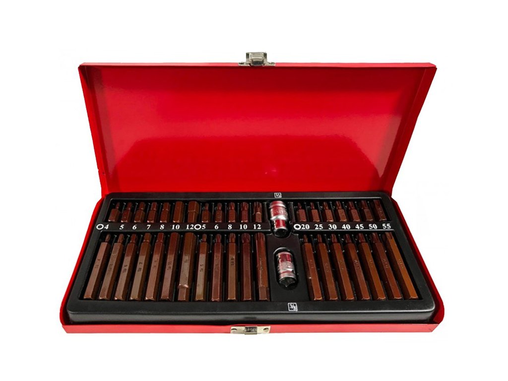 Set de biți profesionale, conceput pentru slăbirea șuruburilor speciale de următoarele tipuri: hexagonal, torx, spline. Varietatea de biți asigură posibilitatea de a efectua multe lucrări în servicii specializate mecanice și auto. Capetele au două lungimi de 30 și 75 mm, fixate într-un suport hexagonal de 10 mm, adaptat pentru utilizare cu un clichet de 1/2' și 3/8'.