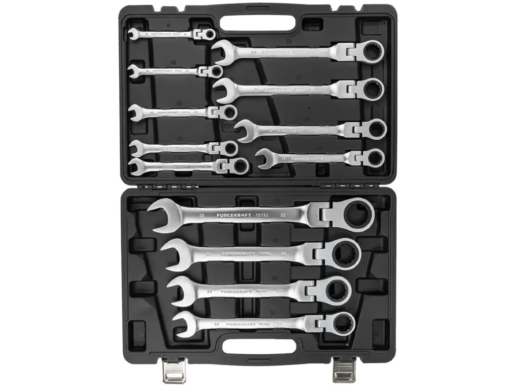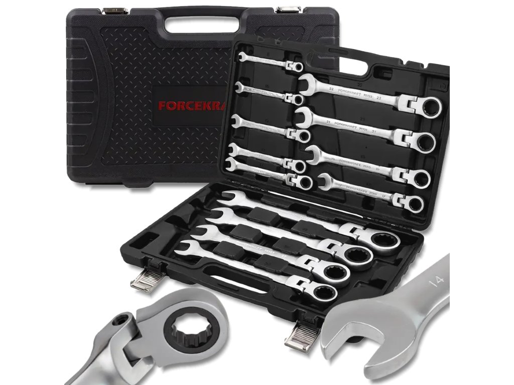 Setul profesional Forcekraft de chei combinate cu articulație și clichet este soluția ideală pentru mecanici, tehnicieni de service și meșteri amatori exigenți care cer calitate, durabilitate și confort în lucru. Datorită combinației dintre clichet, articulație mobilă și prelucrare precisă a oțelului crom-vanadiu (Cr-V), acest set își va dovedi eficiența atât în atelierele de reparații auto, cât și pentru reparații sau asamblări obișnuite.