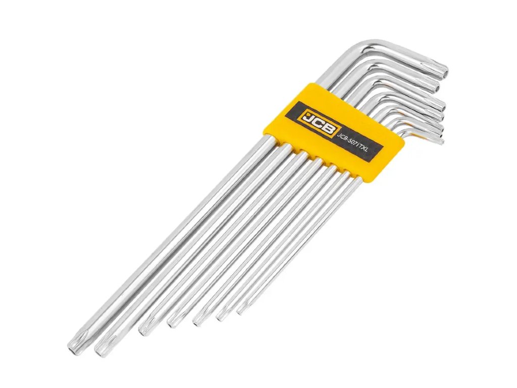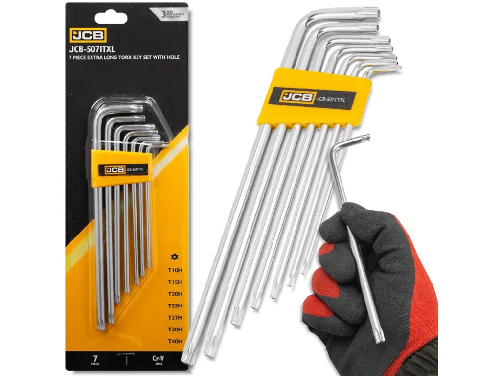 Set de chei lungi TORX JCB tip L cu orificiu, 7 bucăți (T10H–T40H), Cr-V