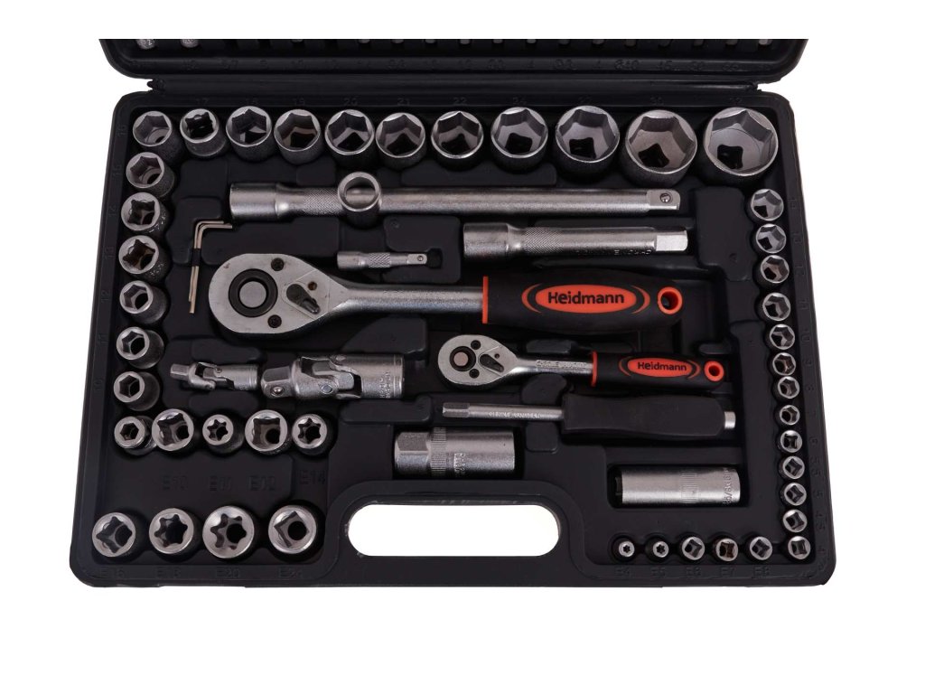 - Include chei tubulare standard și lungi pentru 1/2" și 1/4" și set de biți
