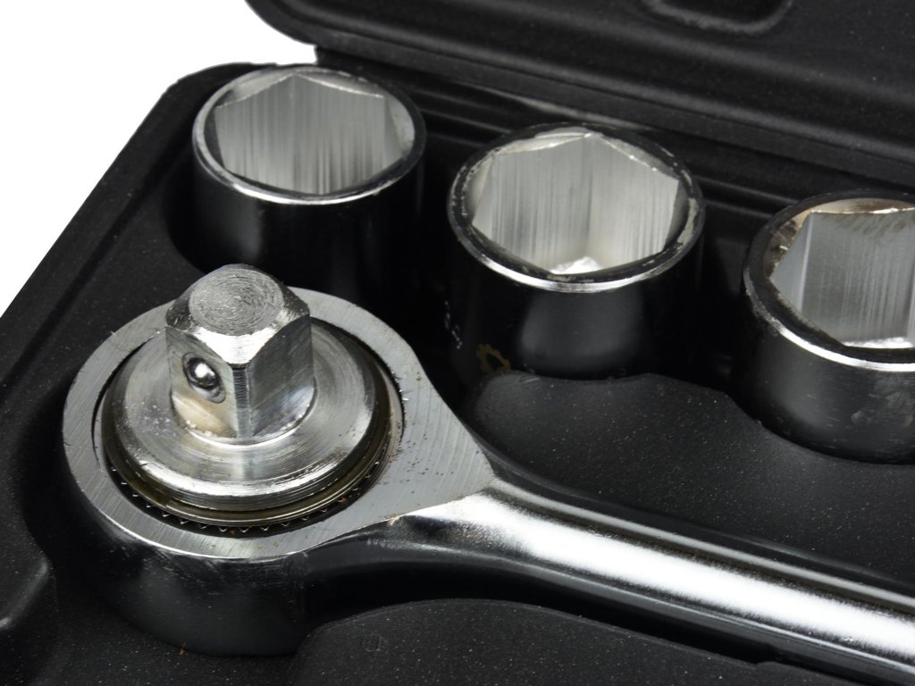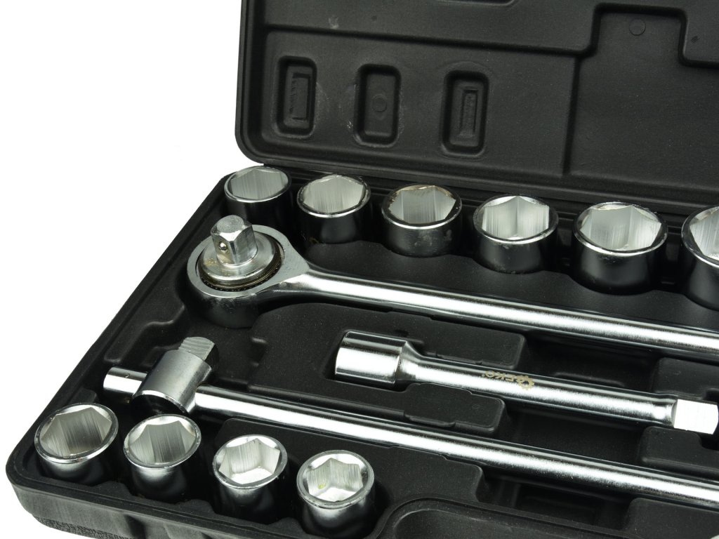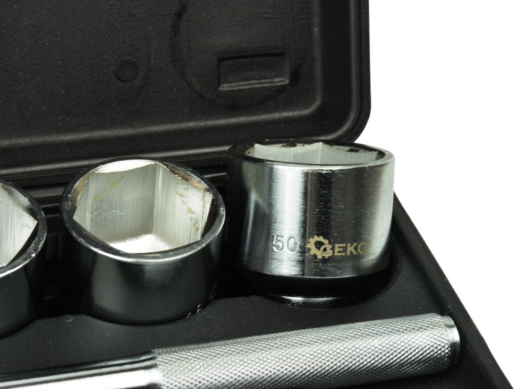 Set de chei tubulare GEKO se compune din 21 de piese. Include un set de chei tubulare hexagonale cu dimensiunea de 3/4", mâner în T (3/4"), clichet (3/4") și set de prelungiri (3/4").