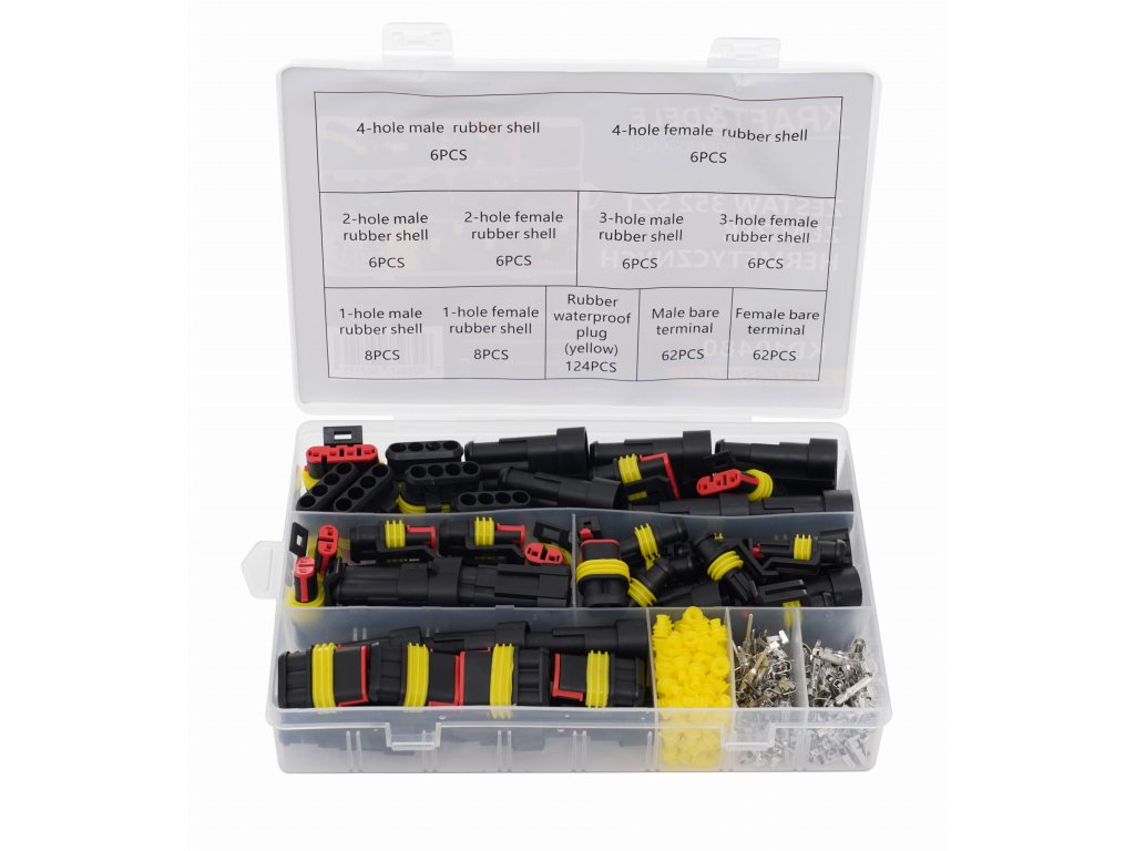 6 x conector bărbătesc, 6 x conector femelă, 12 x pin bărbătesc, 12 x pin femelă, 24 x cuplaj rezistent la apă din silicon