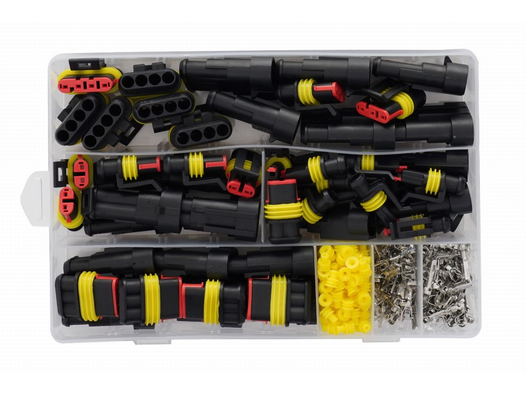 6x carcasă a conectorului masculin, 6x carcasă a conectorului feminin, 24x pin masculin, 24x pin feminin, 48x dopuri etanșe din silicon