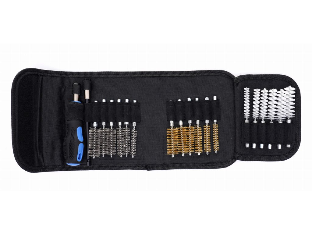 Perii sunt echipate cu prindere hexagonală 1/4" cu cuplă pentru montare facilă într-un burghiu/șurubelniță. În set este inclus și suport și extensie, care permit lucrul în locuri greu accesibile.