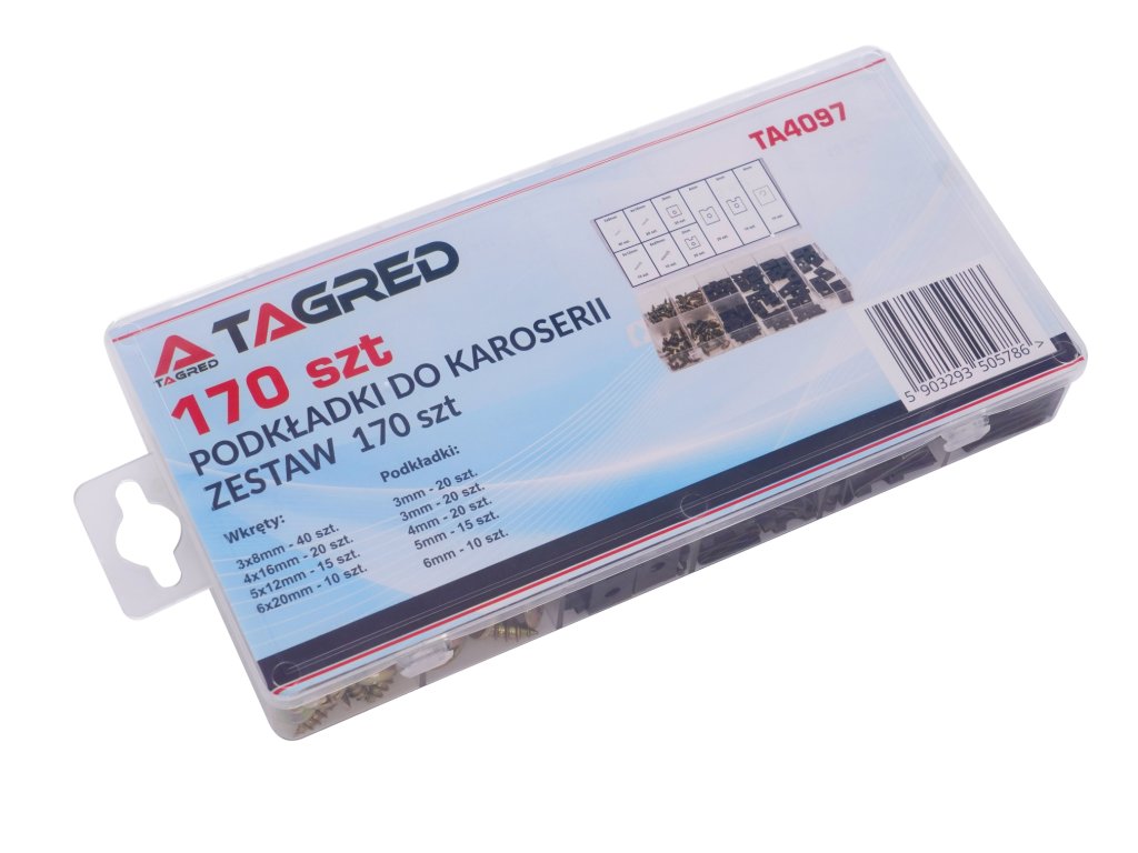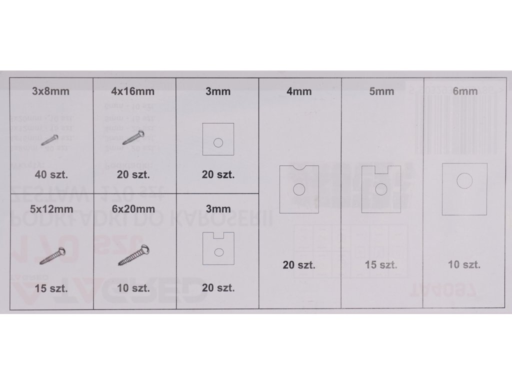 Setul de șuruburi și șaibe pentru caroserie, practic și versatil, include un total de 170 de bucăți de șuruburi și șaibe de diferite dimensiuni, de la M3x8 mm până la M6x20 mm. Aceste șuruburi și șaibe sunt aranjate într-un cutie organizatoare clară care facilitează depozitarea și accesul lor.
