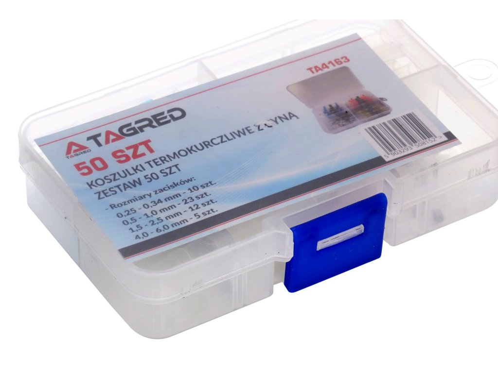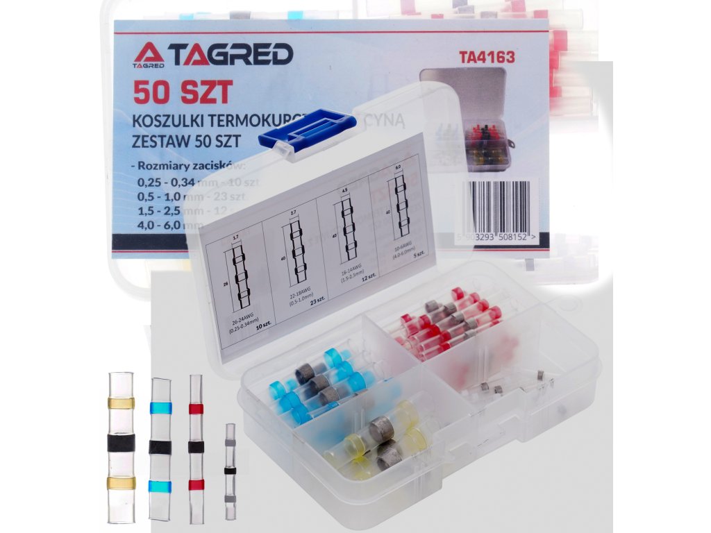 Conexiuni hermetice termocontractabile TAGRED se remarcă prin rezistență excelentă la tracțiune și deteriorare mecanică. Sunt fabricate dintr-un tub din polietilenă cu pereți dubli care oferă protecție externă, iar stratul de cositor din interior asigură o etansare excelentă la apă. În interiorul fiecărei conexiuni rapide se găsește un adeziv special care întărește legătura și o protejează împotriva umezelii. După conectarea conductorilor, nu este necesară nicio izolare suplimentară. Aceste conexiuni rapide sunt ideale pentru utilizare în autoturisme, bărci, motociclete și în gospodărie.