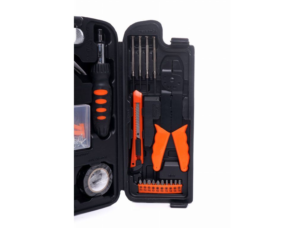 Întreaga trusă conține 129 piese diferite, asigurând alegerea potrivită a uneltelor în funcție de necesități. Uneltele sunt fabricate din oțel crom-vanadiu tratat (CrV), destinat atelierelor. Cromul asigură rezistența oțelului la coroziune, oxidare, uzură și o rezistență ridicată la temperaturi înalte. Adăugarea vanadiului împiedică creșterea granulației în timpul prelucrării și, în același timp, mărește ductilitatea atât a oțelului călit, cât și a celui temperat.