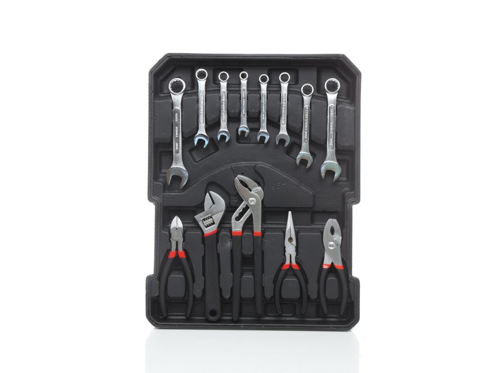 chei plate, chei cu soclu, rucrnă, ciocan, set de clește, nivelă, cleme, bandă de măsură, bandă izolatoare, lamă, set de cuișoare și șuruburi, precum și șurubelnițe și biți.