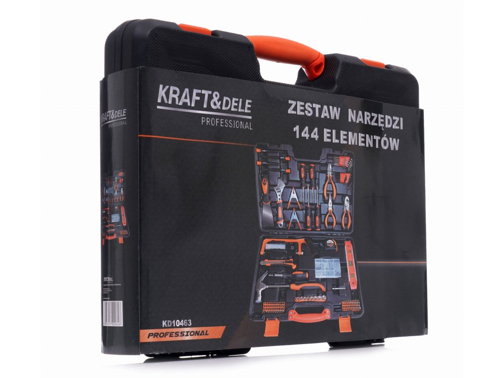 Set de unelte 144 piese KD10463, marca Kraft&Dele. Uneltele se remarcă printr-o construcție solidă, materiale durabile și o cutie de scule din plastic rezistentă, unde fiecare unealtă își are locul său.