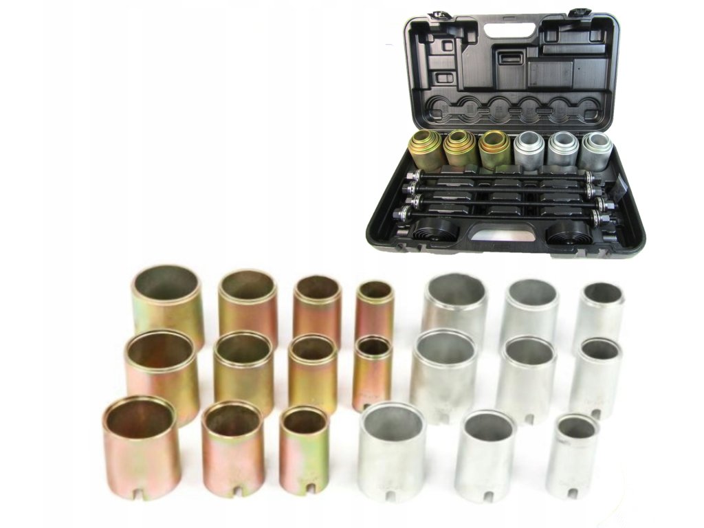 Un set pentru presarea/extrudarea bucșelor metalice-cauciuc pe un vehicul fără a fi nevoie de demontarea brațelor. Setul poate fi utilizat pe o presă hidraulică sau cu o rolă de tragere.