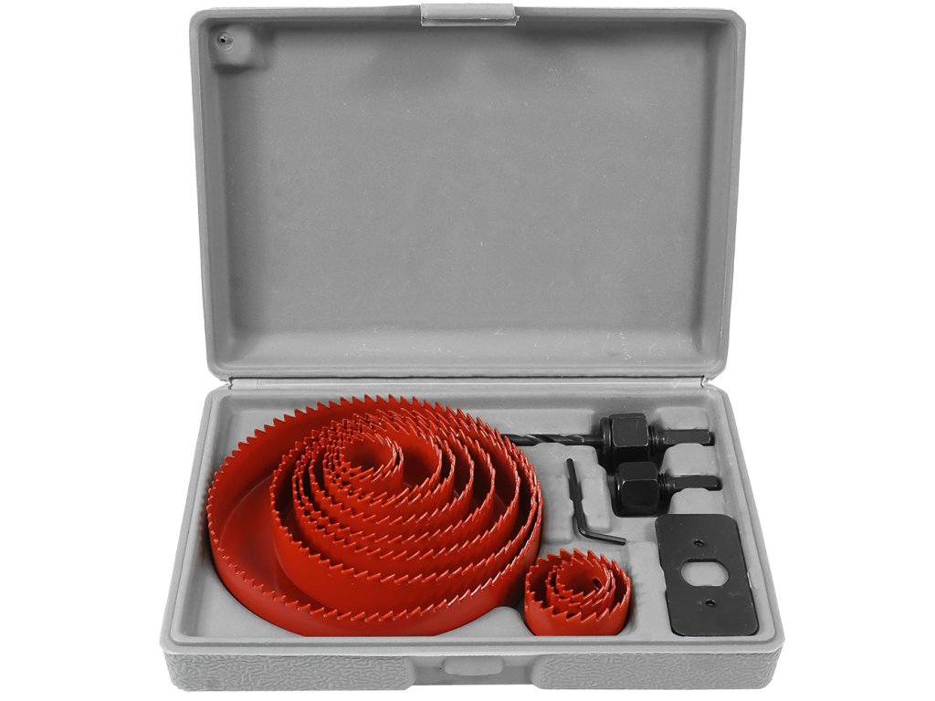 - 12 coroane de tăiere cu diametre: 19 mm, 22 mm, 25 mm, 29 mm, 38 mm, 44 mm, 51 mm, 64 mm, 76 mm, 89 mm, 102 mm, 127 mm