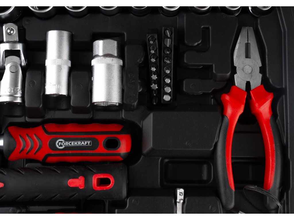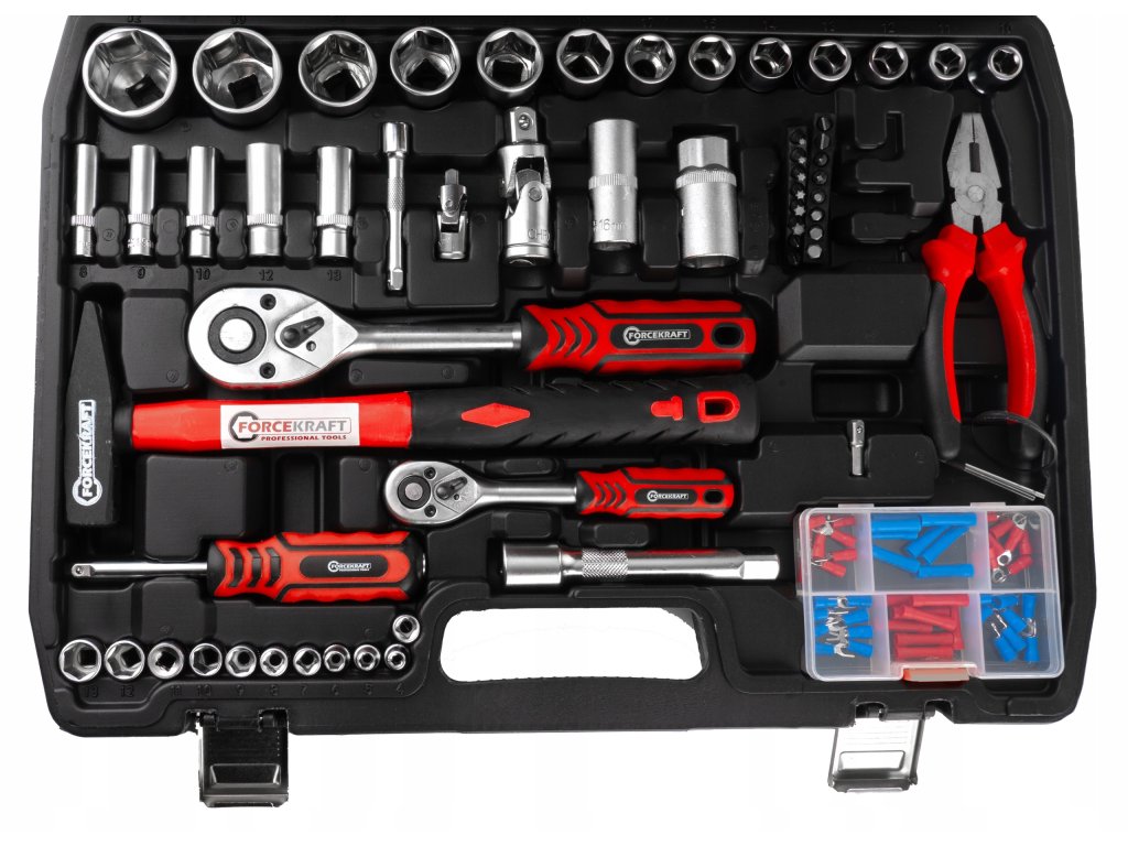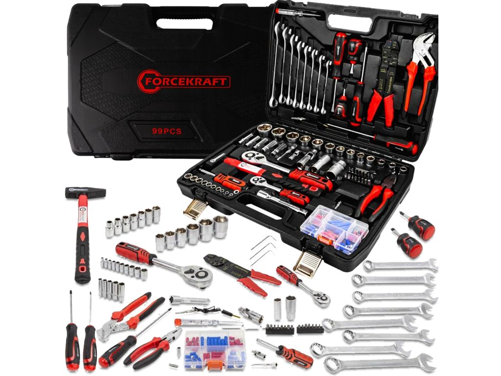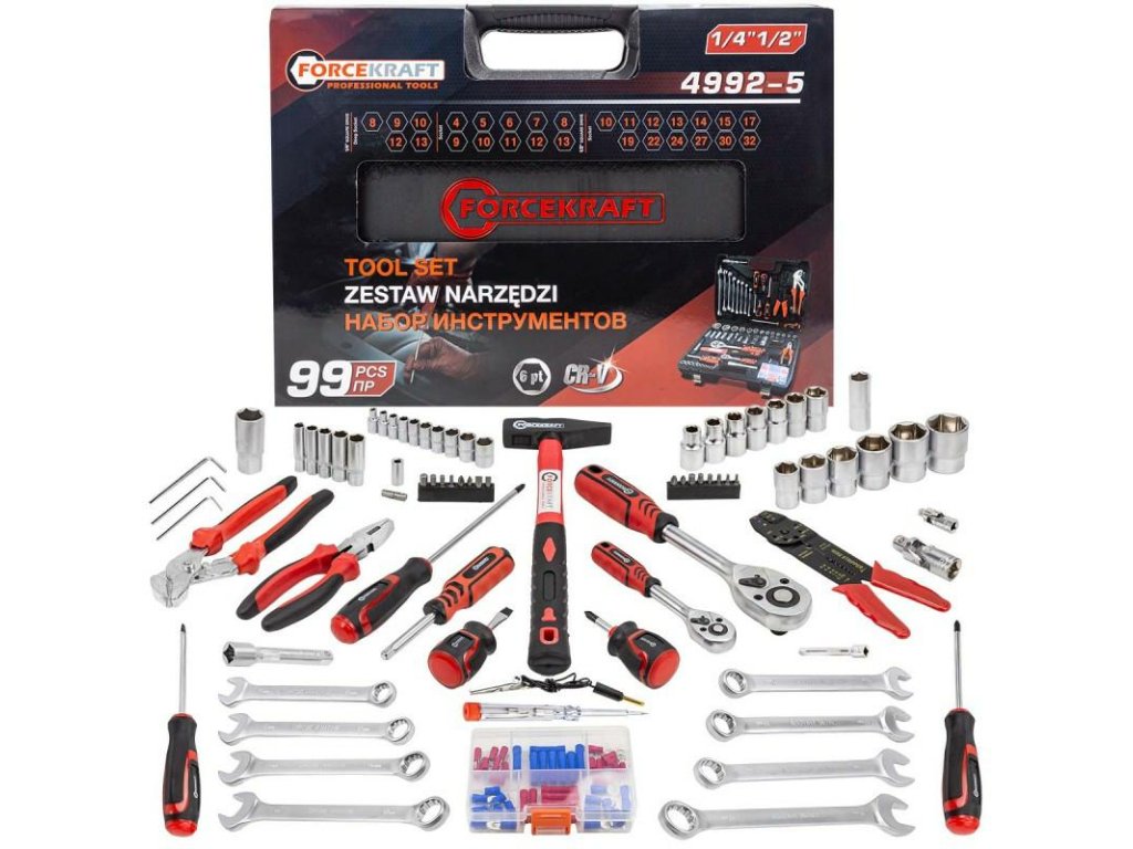 Forcekraft FK-4992-5 este un set complet de scule universale, găzduit într-o geantă de transport practică și durabilă. Setul, format din 99 de elemente atent selectate, este conceput pentru meșterii amatori, pasionații de tehnicitate și cei care lucrează zilnic cu unelte în garaj, atelier sau pe teren.