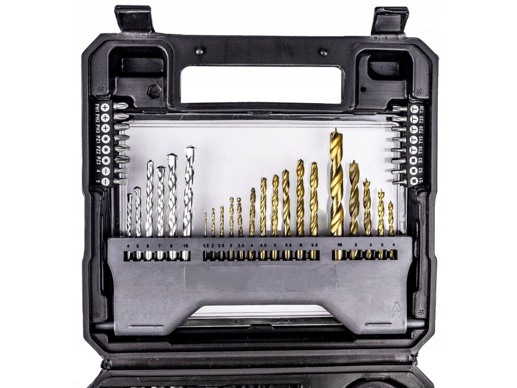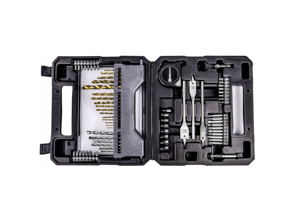 Conține un total de 71 de piese : un set complet de burghie pentru metal, lemn și beton, precum și burghie, chei tubulare, adaptoare, o conică și o ruletă. Fiecare piesă își are locul într-o cutie practică și robustă din plastic, care asigură ordinea și accesul facil la unelte.