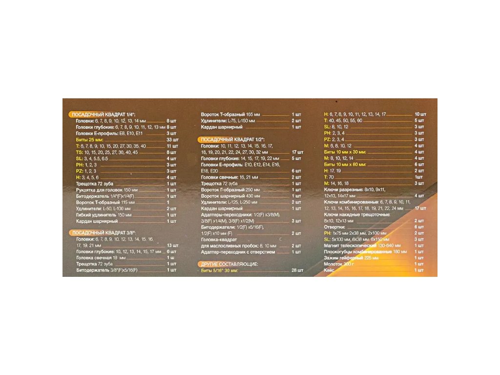 Un set universal de scule care conține o gamă largă de chei tubulare, biți și accesorii în standarde de 1/4", 3/8" și 1/2". Excelent atât pentru atelierele de reparații auto profesioniste, cât și pentru pasionații de bricolaj. Datorită prezenței biților hexagonali, cu douăsprezece vârfuri, cu profil E și TORX, setul vă permite să lucrați cu aproape toate tipurile comune de șuruburi și piulițe.