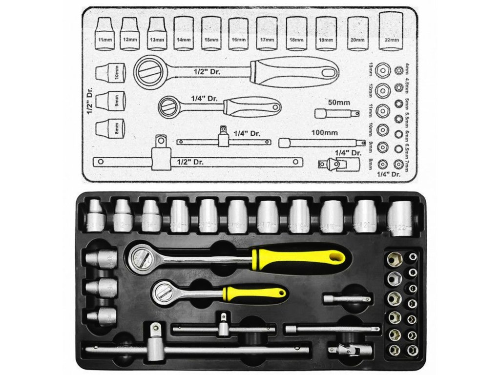 În loc să cumpărați articole individuale, cum ar fi un ciocan, un clește, o foarfecă, o șurubelniță sau o cheie tubulară, aveți totul la un loc.