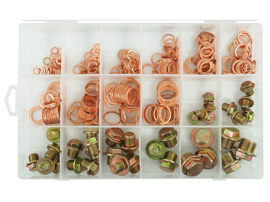 Set de 534 bucăți de șaibe din cupru și dopuri de scurgere a uleiului . Acest set include dimensiuni de la 6 mm la 20 mm. Marfa se așează într-un ambalaj practic tip „organizator”.