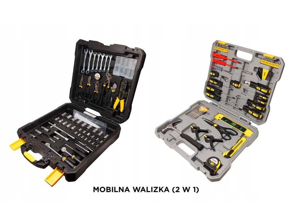Set de scule într-o valiză (valiză mobilă 2 în 1). Roțile încorporate facilitează mutarea valizei și un mâner telescopic. Valiză de scule perfect realizată. Întregul set este realizat cu accent pe calitatea solidă. Valiză cu roți și mâner telescopic retractabil pentru transportul setului (ca o valiză de călătorie).