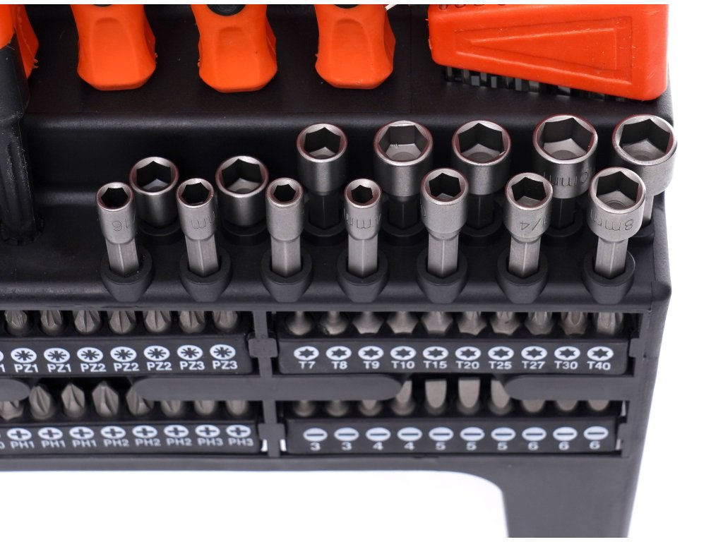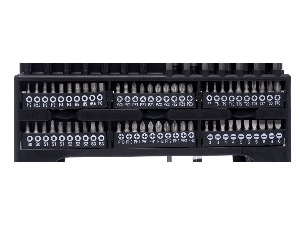 Utilizarea materialelor de înaltă calitate în producția șurubelnițelor și a biților prelungește durata lor de viață. Setul conține 122 piese.