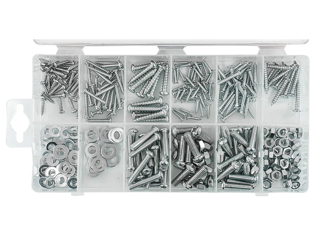 Set de 347 bucăți de șuruburi și piulițe . Totul este ambalat într-o cutie de plastic.