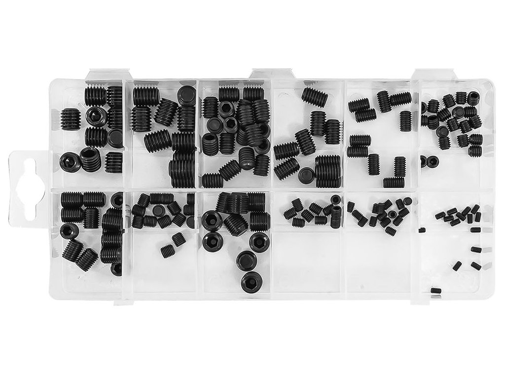 Set de 160 de șuruburi Allen fără cap - șuruburi de fixare. Setul include dimensiuni de la 3x5 mm la 10x12 mm. Totul este depozitat într-un pachet practic de tip „sortator”.