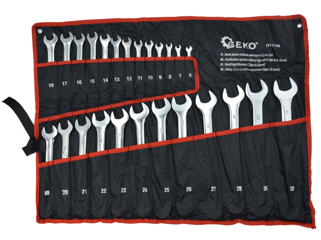 Seturi de chei combinate lustruite 6-32mm 25buc G11146 sunt fabricate din oțel crom-vanadiu de înaltă calitate (CrV). Setul include și o husă rezistentă din material textil cu închidere cu arici și posibilitate de agățare pe perete, asigurând astfel o organizare și depozitare ușoară.