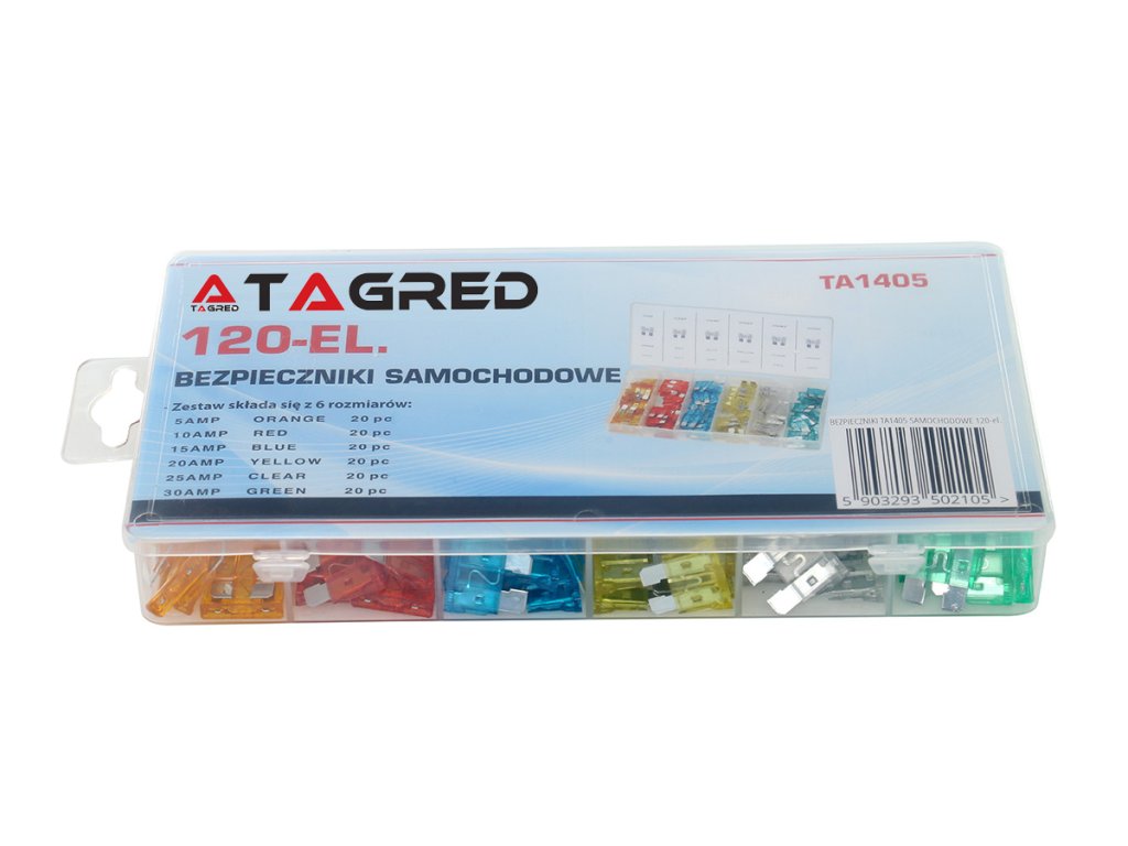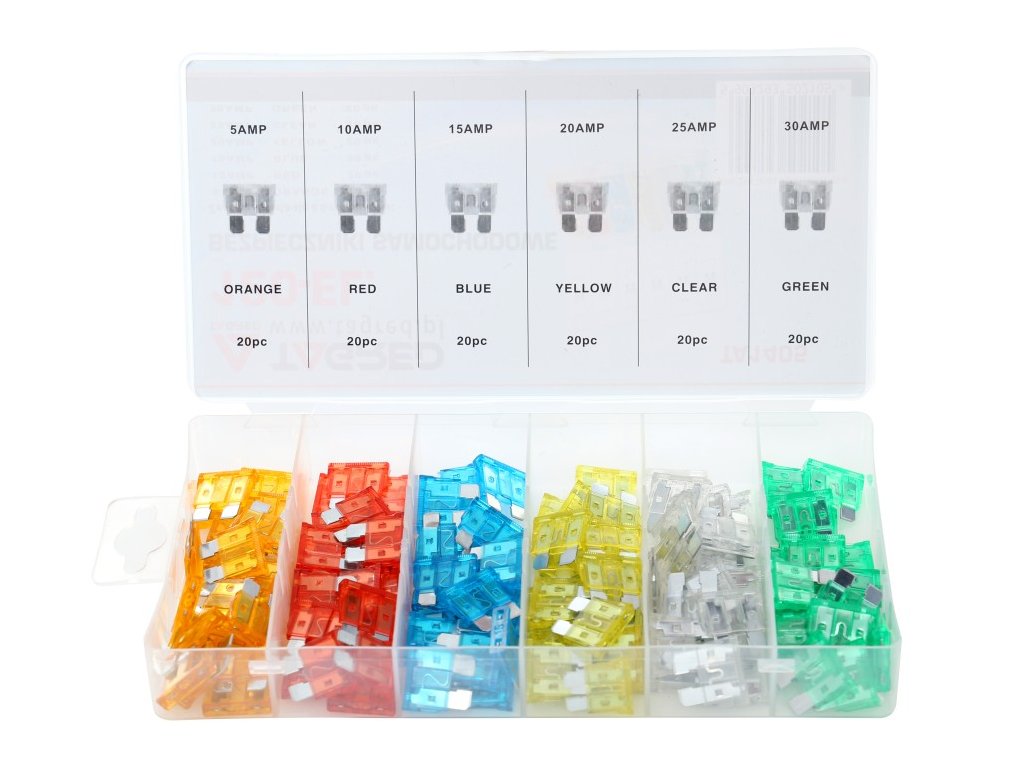 Acest set conține siguranțe auto plate mari, care sunt aranjate și codificate pe culori în funcție de valoarea curentului, într-un sorter practic din plastic.