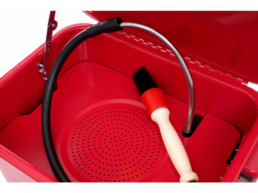 Spălător de piese pentru atelier 13 L KD424 funcționează în circuit închis. Lichidul este aspirat de pompă din fundul rezervorului și livrat sub presiune.