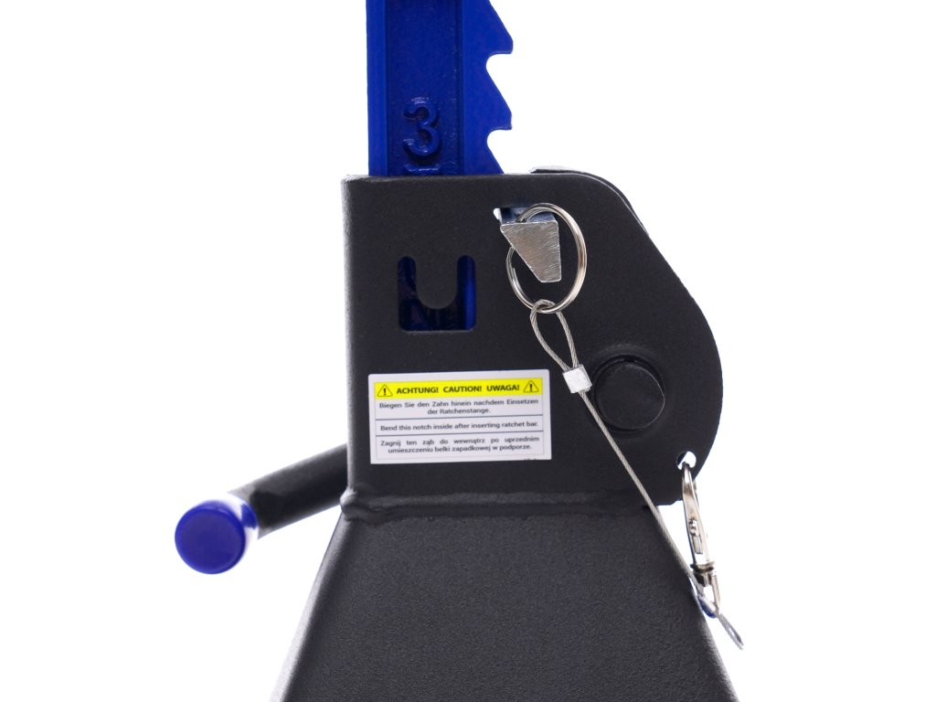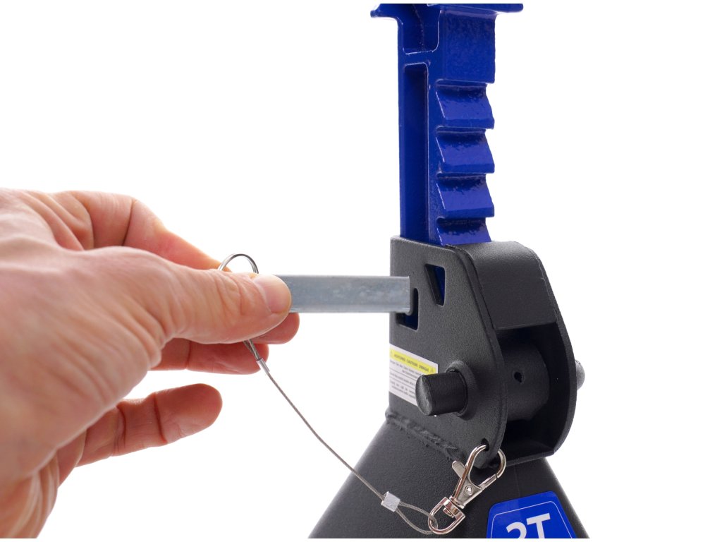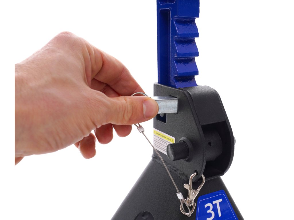 Standurile noastre sunt dotate cu BLOCARE mecanică DUBLĂ, care asigură siguranța maximă în utilizare! O blocare specială suplimentară sub forma unui pin protejează mecanismul cu pini împotriva eliberării accidentale a stâlpilor de susținere. Pinul este fixat cu un cablu de oțel de corpul standului, garantând că nu poate fi pierdut.