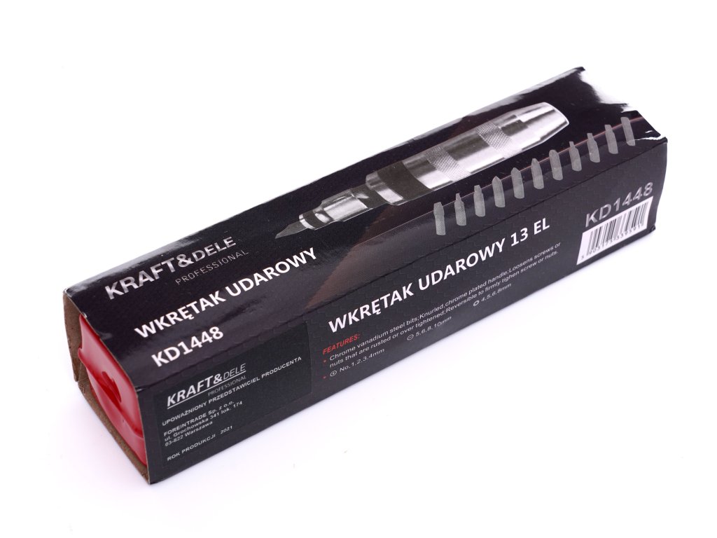 Șurubelniță cu percuție pentru expulzare, împreună cu setul de biți model KD1448 de la marca Kraft&Dele, este potrivită pentru orice garaj sau atelier.