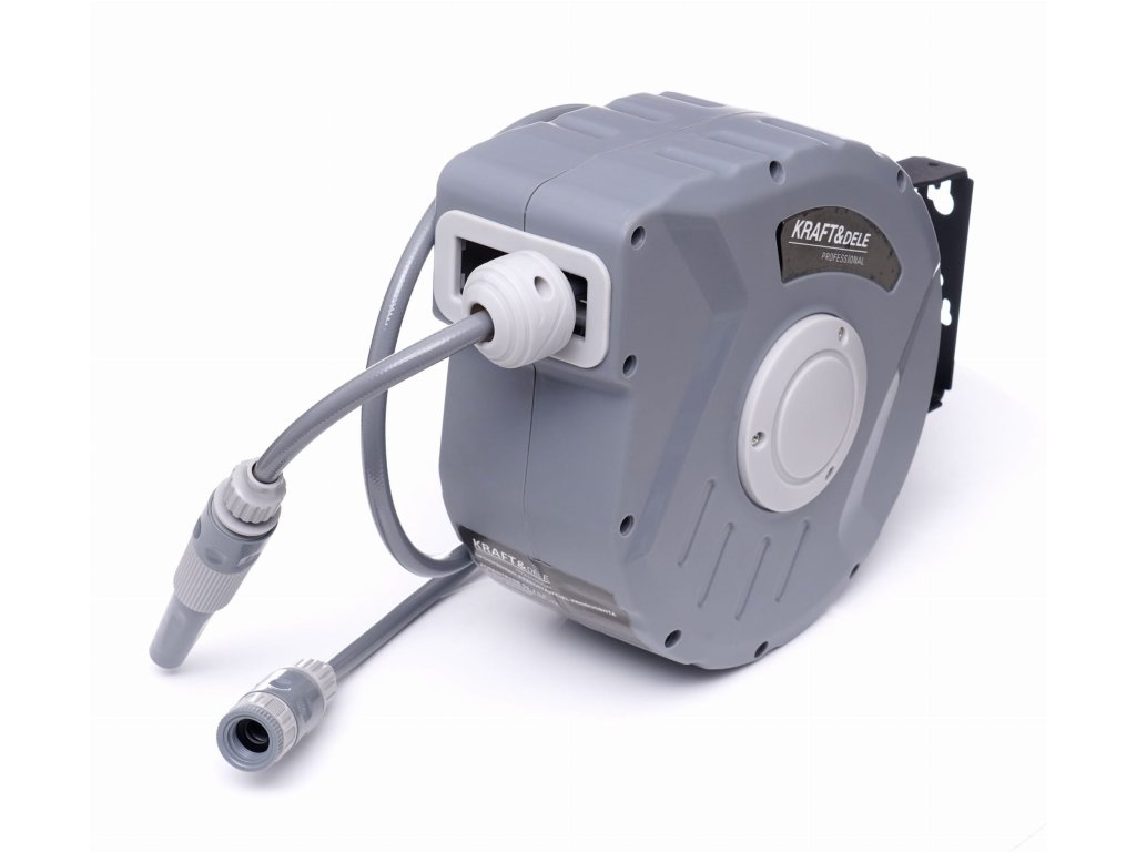 Tambur automat pentru furtun de grădină marca Kraft&Dele, model KD2081, destinat celor care apreciază confortul. Tamburul este prevăzut cu un mecanism care permite derularea automată a furtunului, precum și o siguranță pentru alegerea lungimii dorite. Datorită mânerului foarte confortabil și greutății reduse de 3,5kg, poate fi transportat cu ușurință.