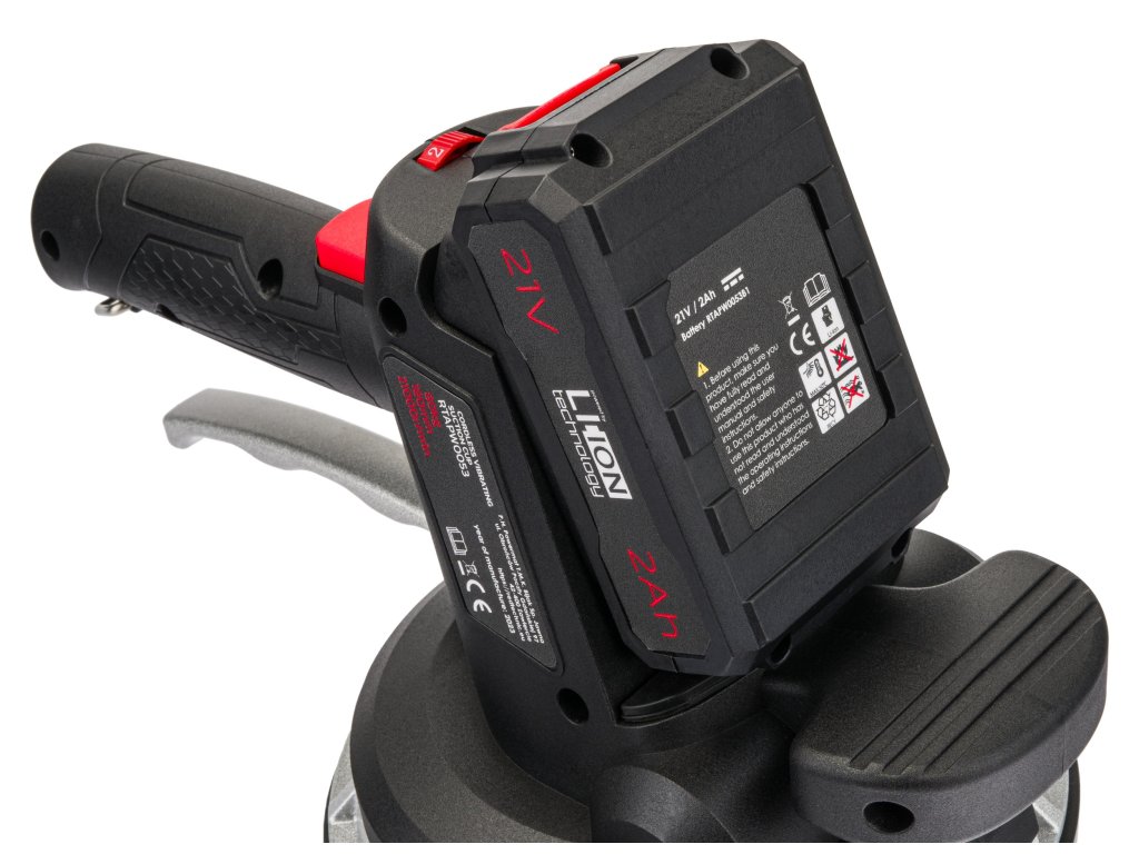 Lățimea ventuzei este de 180 mm, în pachet sunt incluse 2 acumulatori 21 V / 2 Ah.